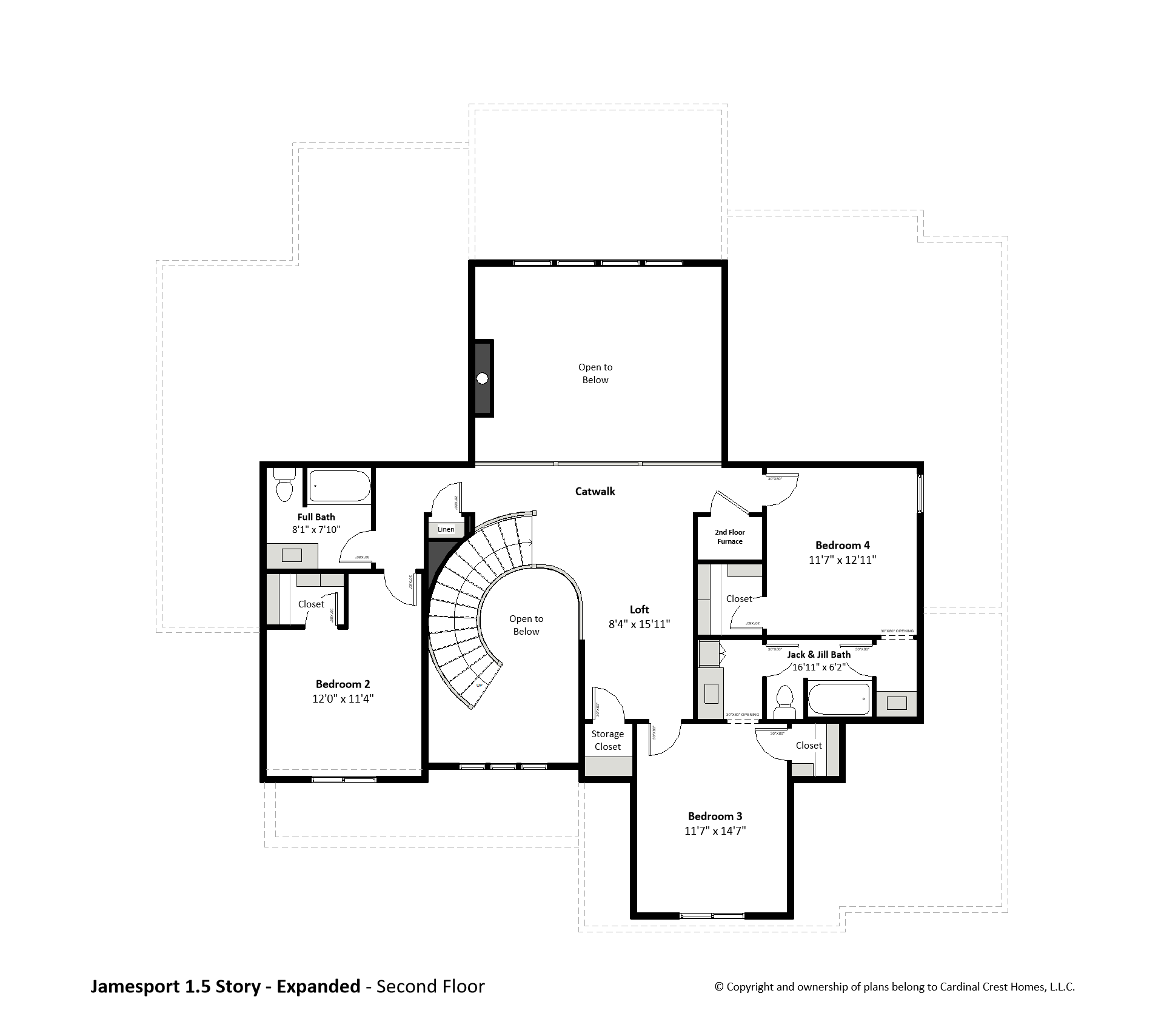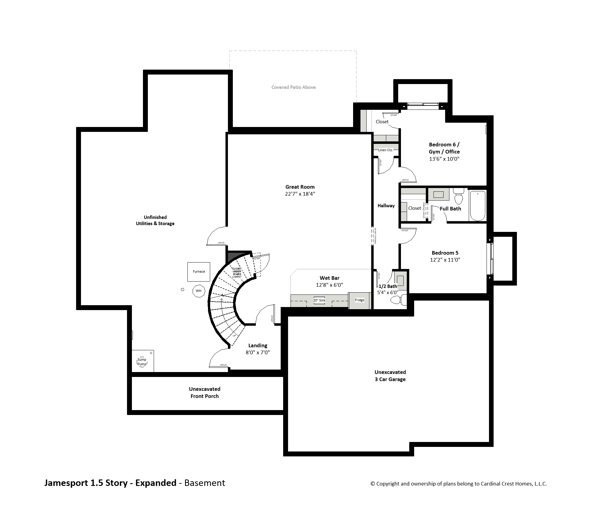 - Unfinished Basement Plan (*if applicable) - an unfinished basement plan will show the basement finish / layout, but will halftone (or gray out) the walls and text to indicate that the basement will be finished at a future date. On 1.5 Story, 2 Story, and Estate plans, we include both a finished basement plan and an unfinished basement plan so you can decide if you'd like to finish the basement during the build or keep it unfinished.