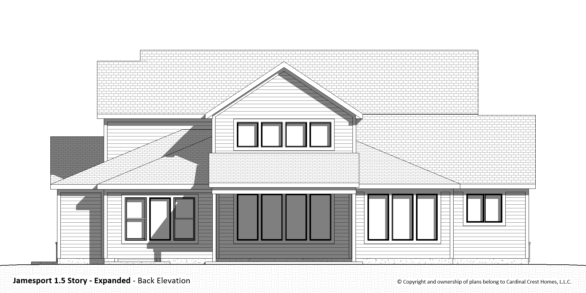 - Front & Back Elevations - exterior elevations showing the front and back of the home, including callouts for exterior materials, windows, approximate grade line, plate heights, etc.